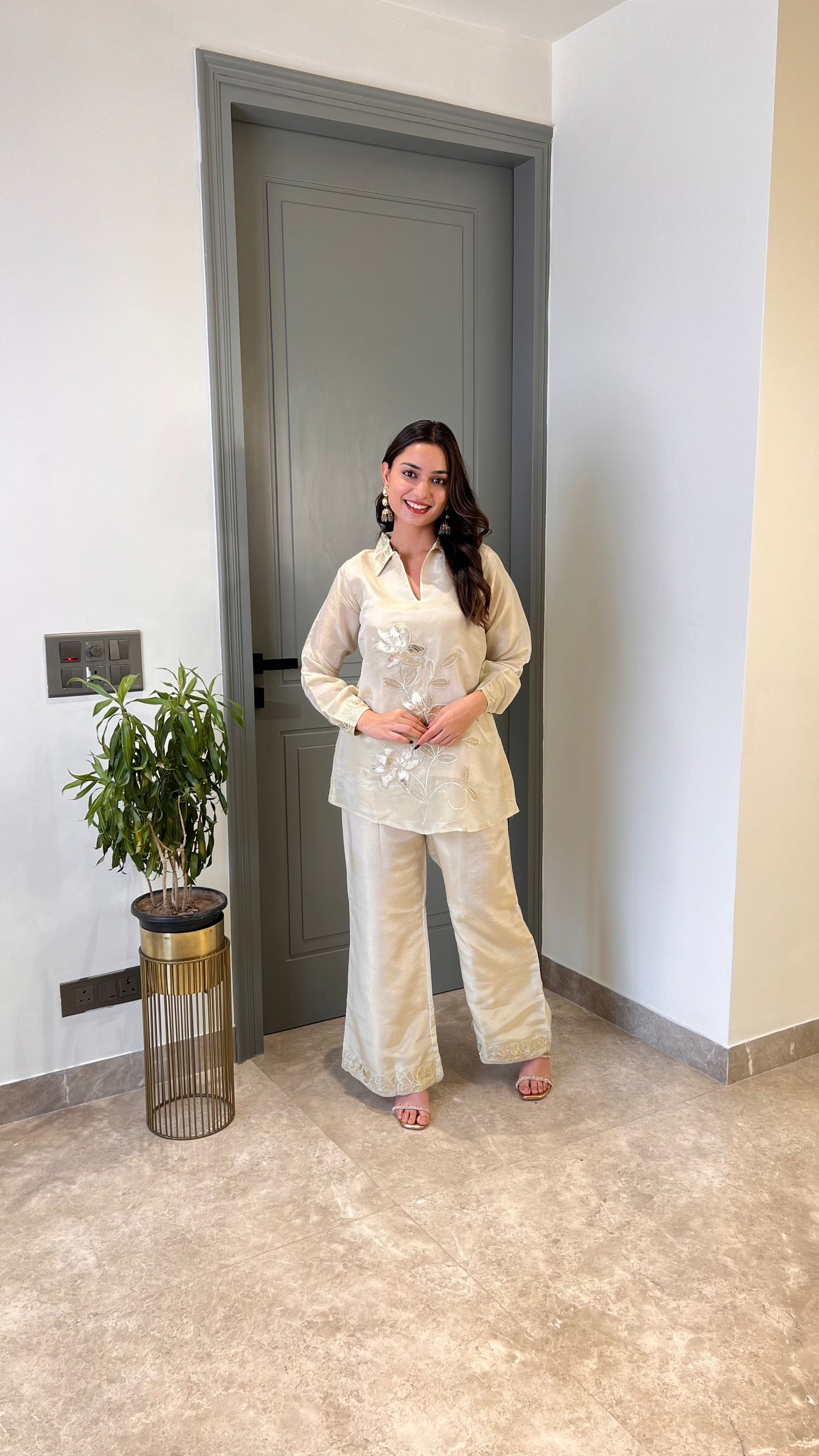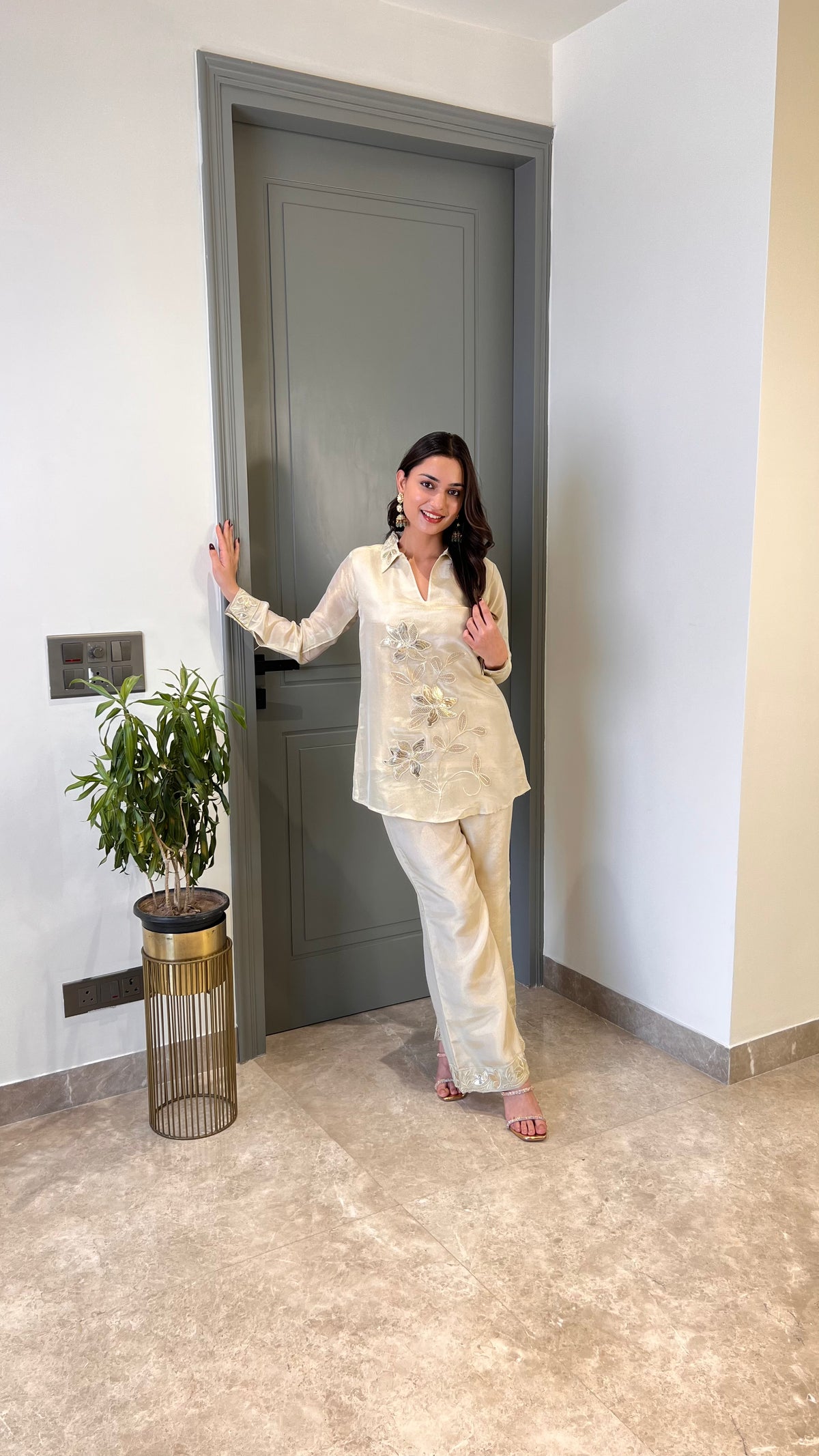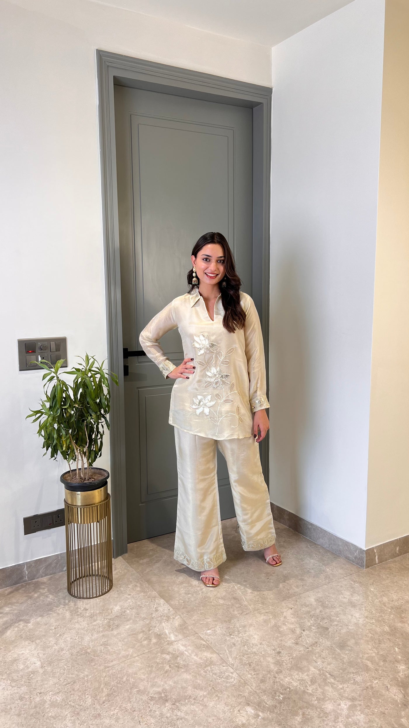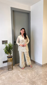 Details: Tissue Cord Set With Leather Patch Work.