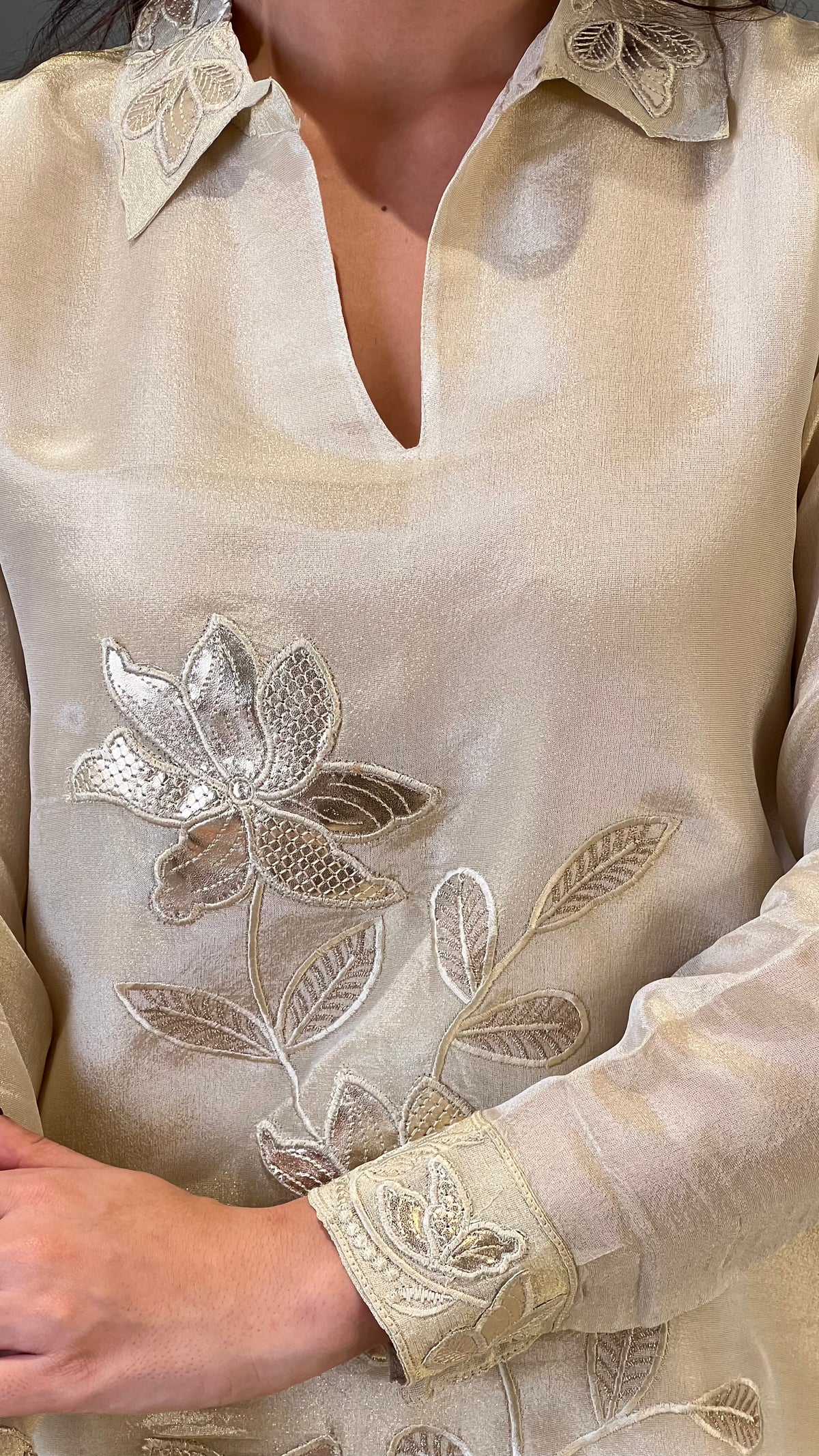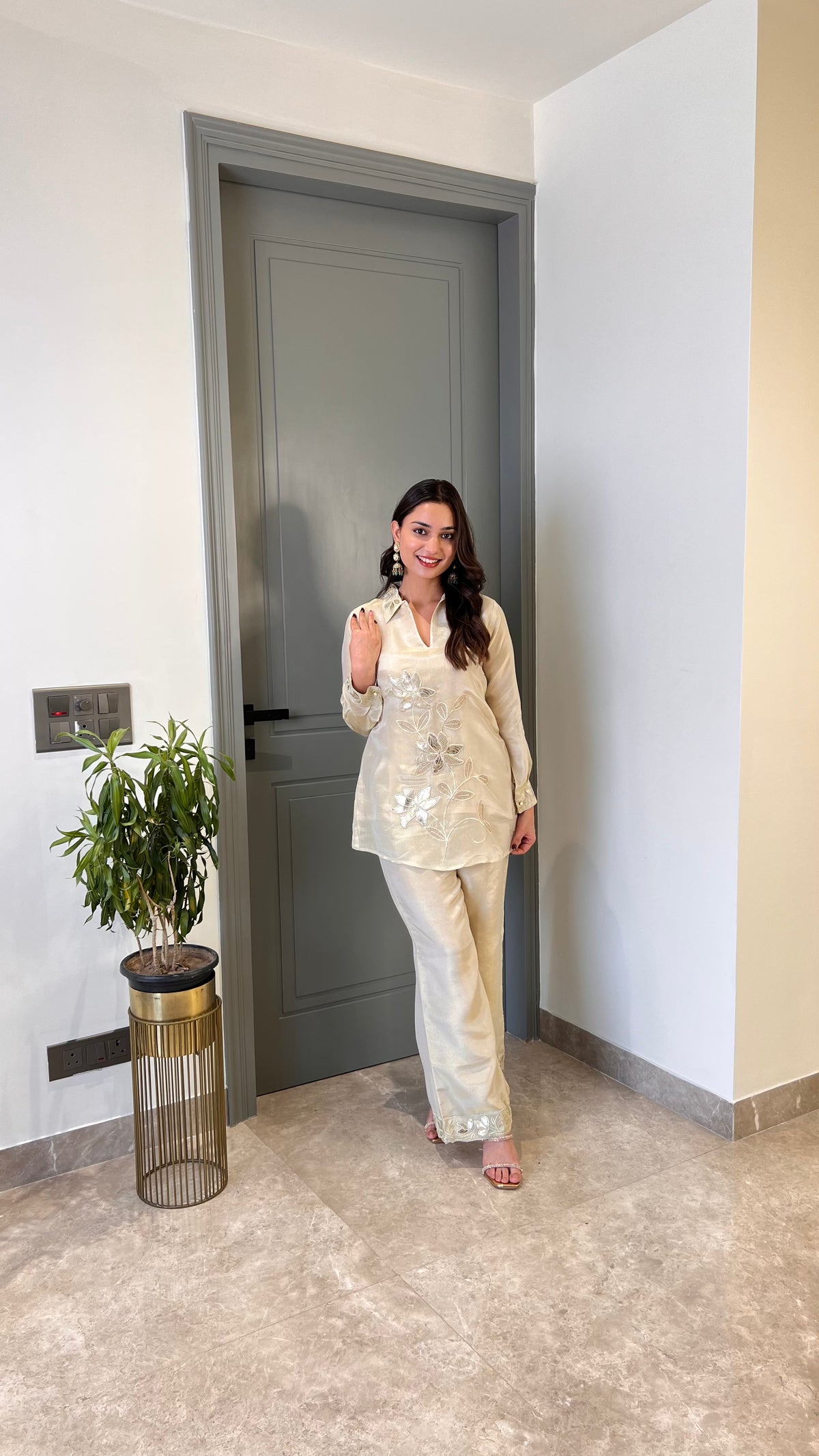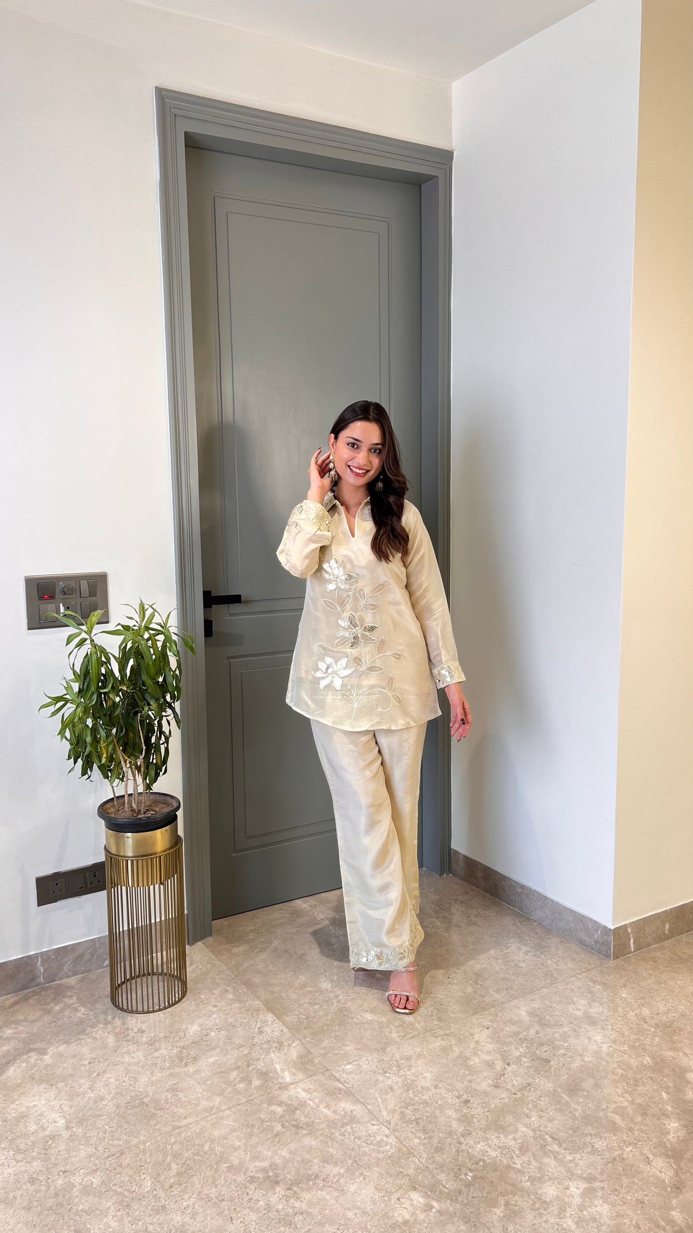 Details: Tissue Cord Set With Leather Patch Work.