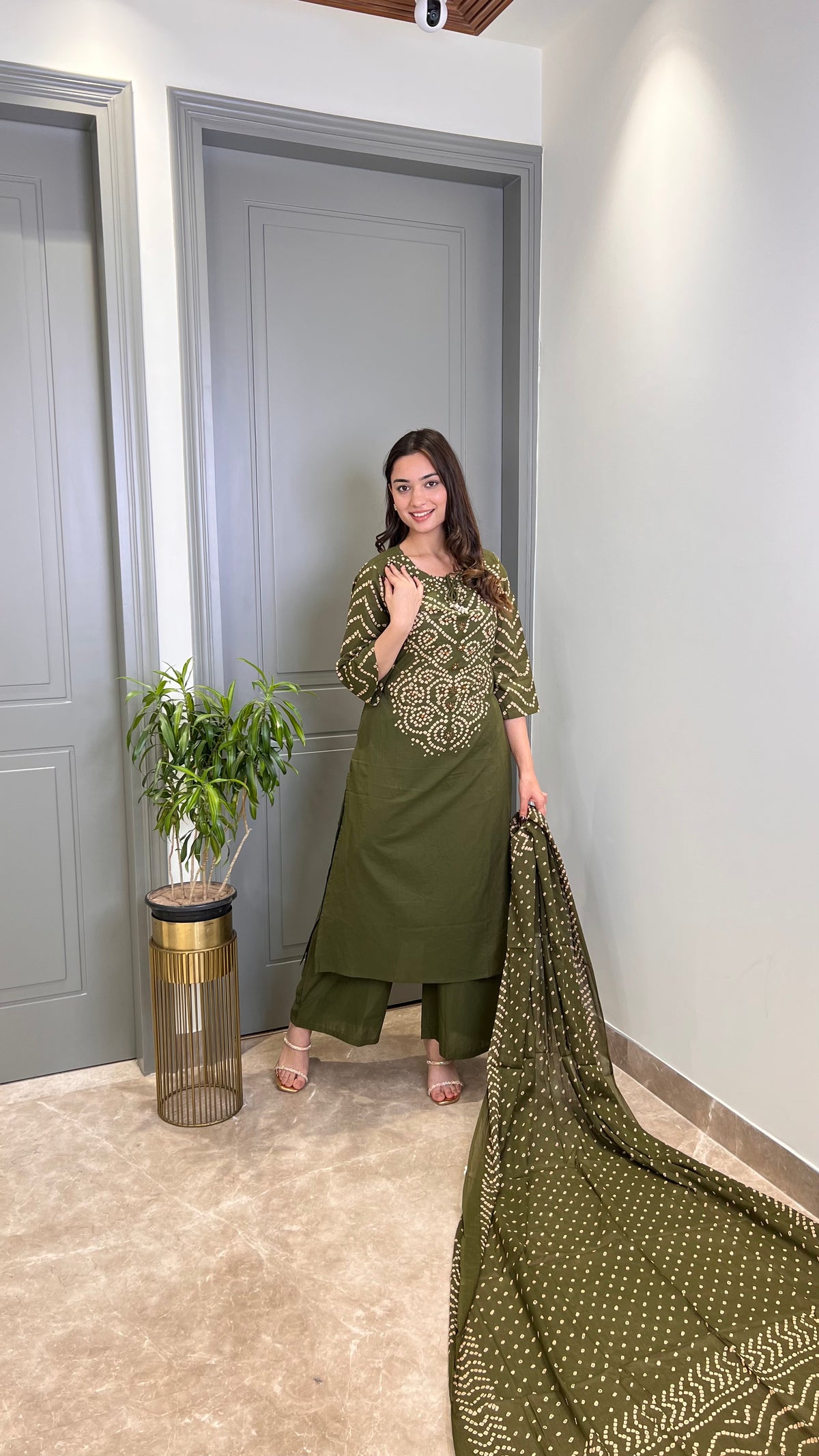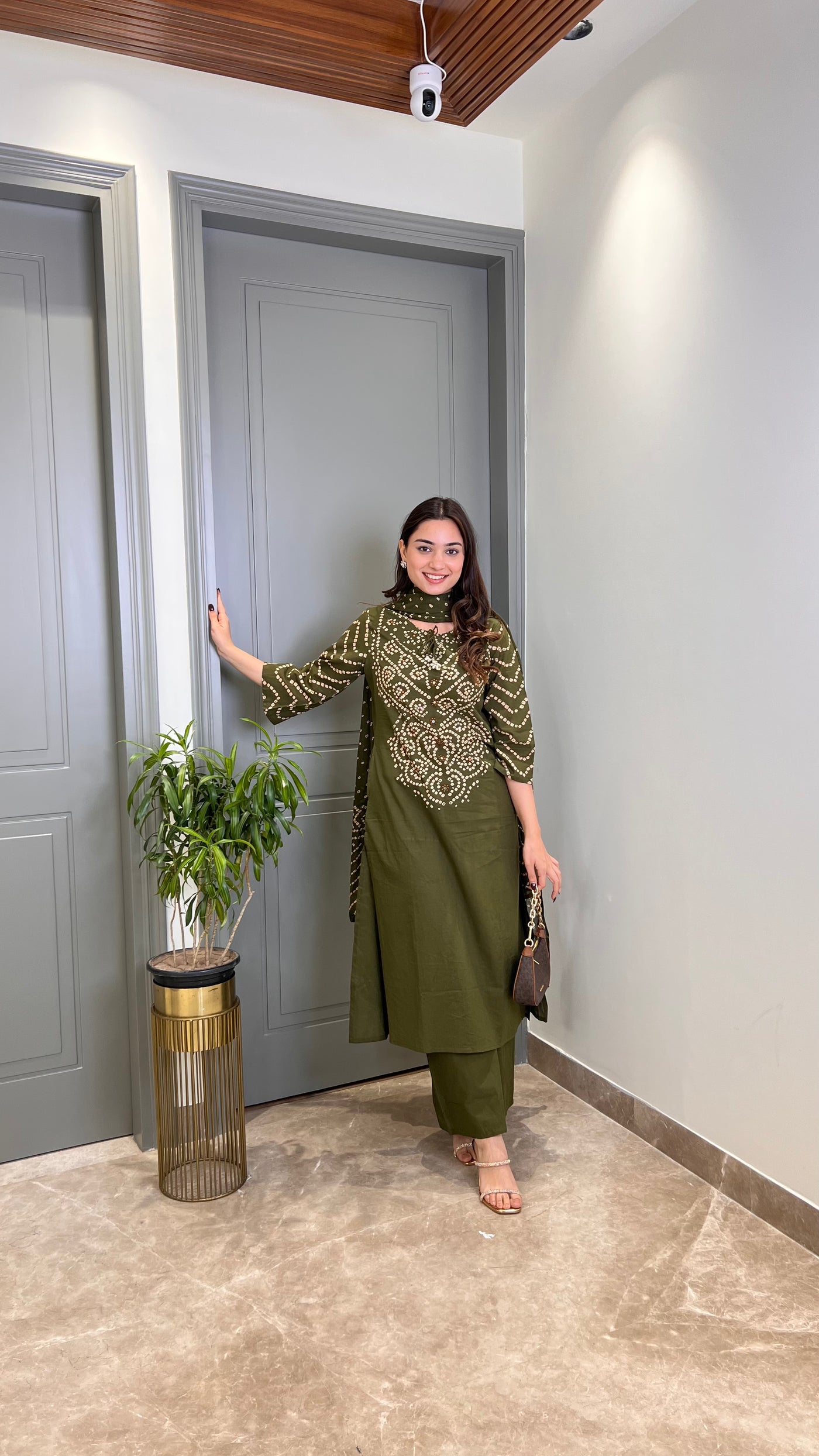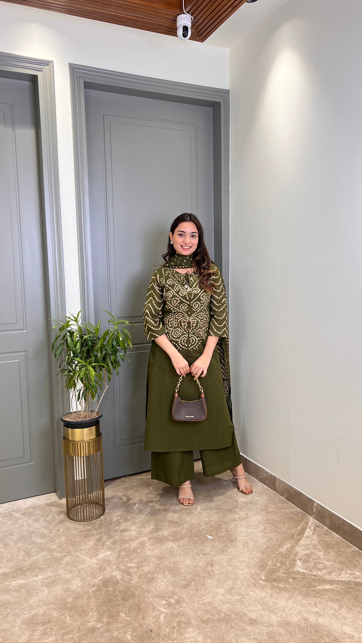 Details:  Pure Cotton Suit Set in Bandhej Print on all Over Sleeves and Bust Area.