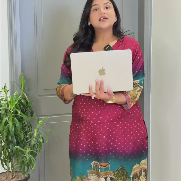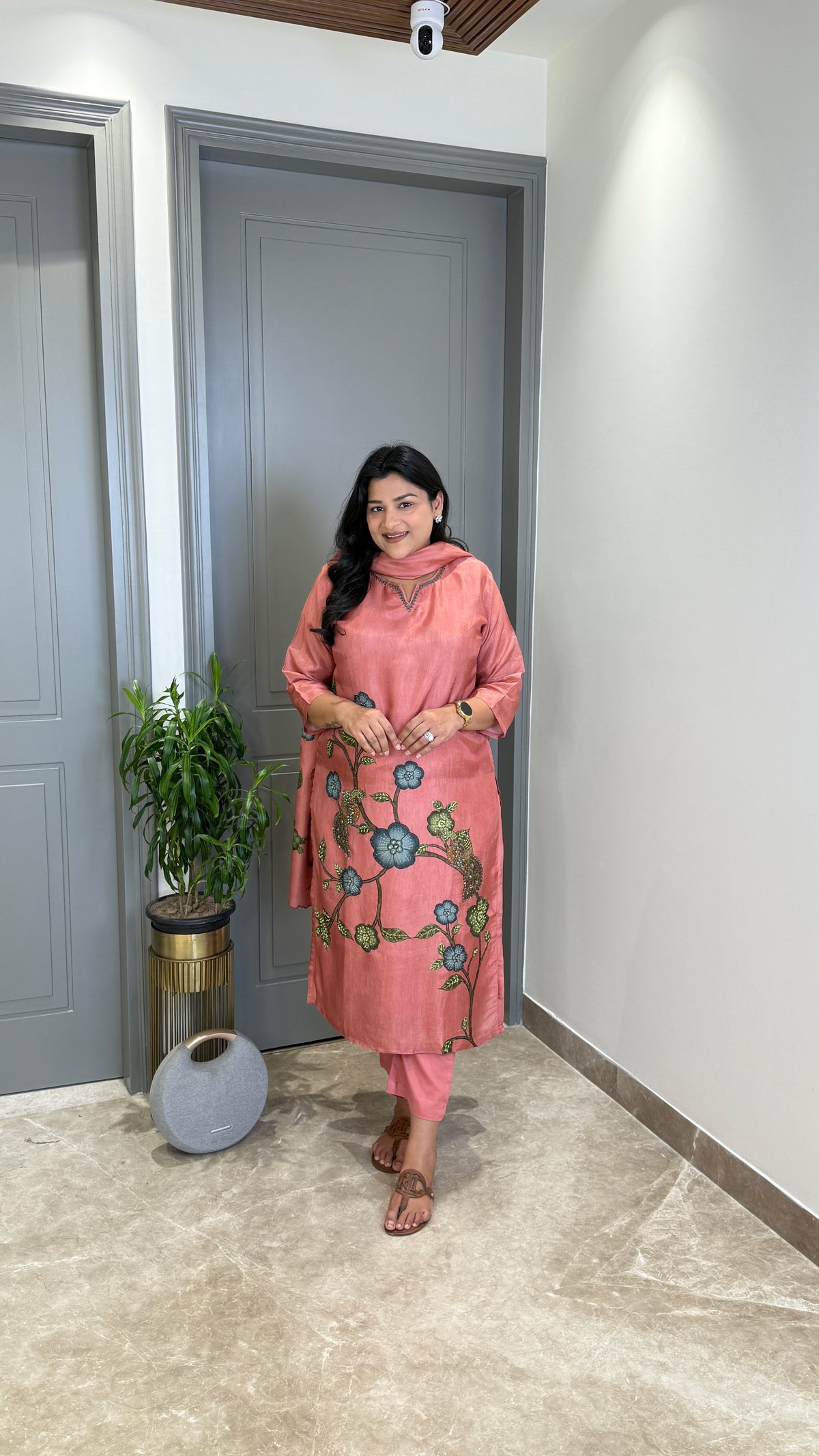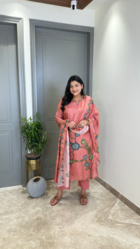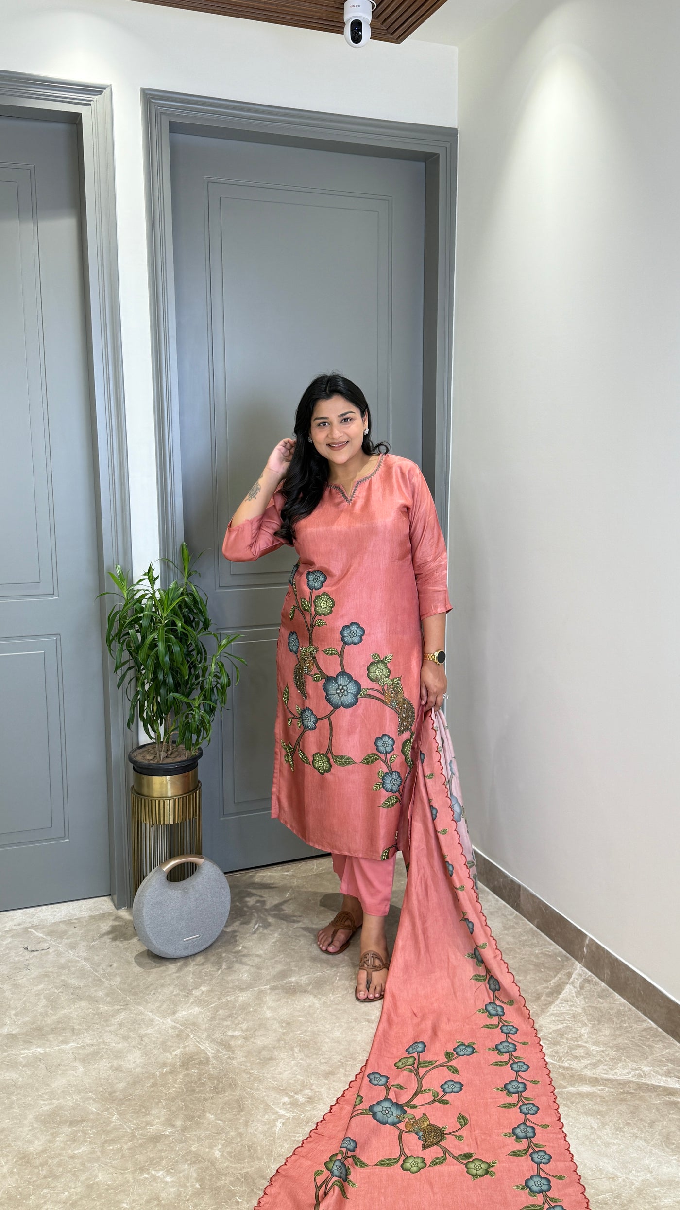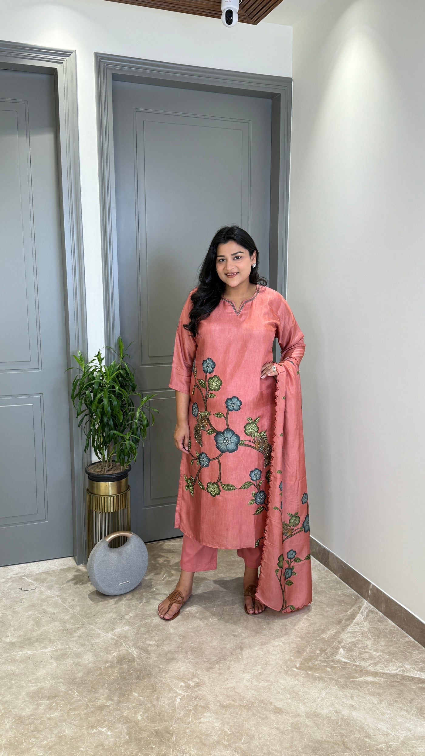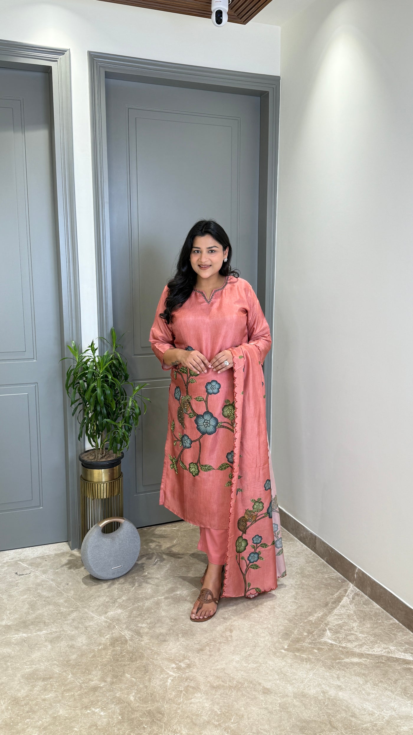 Details: Silk Suit Set With Kalamkari Print On The Suit and Kantha Handwork Detailing On The Kurta Daman.