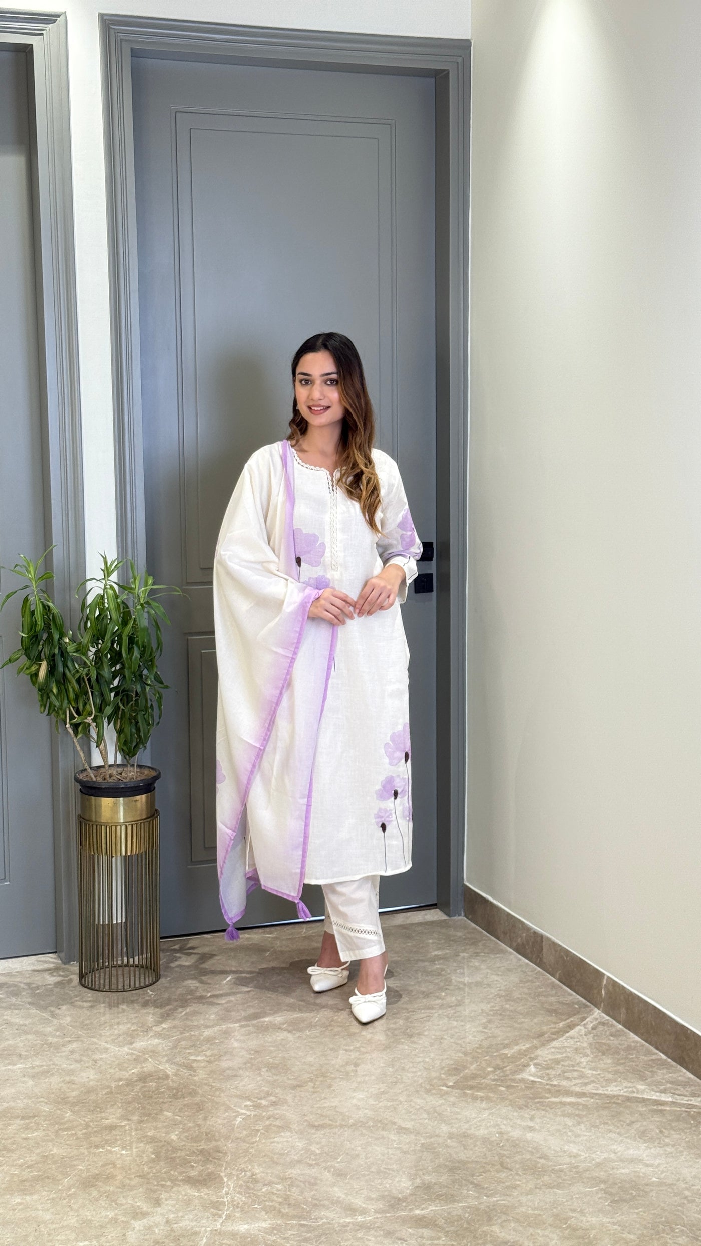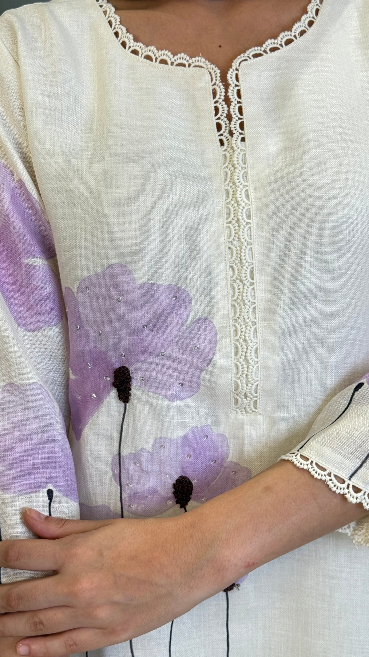 Details: Flex Cotton Suit Set With Lace Detailing On The Neckline and Sleeves.