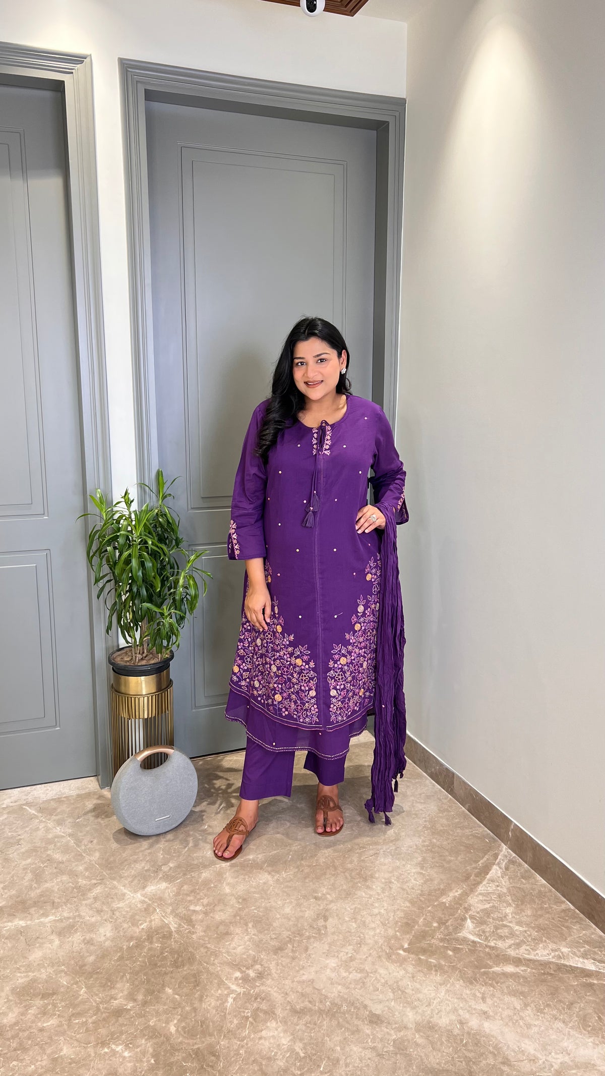 Details: Premium Cotton A-Line Suit Set With Heavy Threadwork Jaal Detailing Work On The Kurta Daman and Stylish Sleeves.